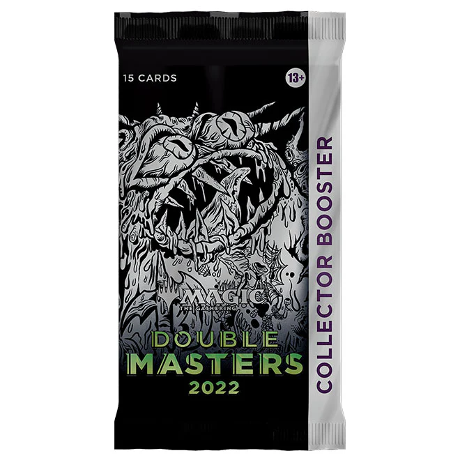 Each Double Masters 2022 Collector Booster contains 15 cards and 1 Traditional Foil double-sided token, with a combination of 4 cards of rarity Rare or higher, 2–6 Uncommon, and 5–9 Common cards. Every pack contains 10–11 Traditional Foil cards and 1 Rare or Mythic Rare Foil-Etched card.