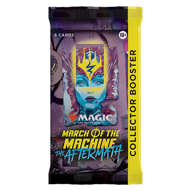 The March of the Machine: The Aftermath Collector Booster Box contains 12 March of the Machine: The Aftermath Collector Boosters. Each Collector Booster contains 6 Magic: The Gathering cards and 1 Traditional Foil double-sided token, with 4 cards of rarity Rare or higher and 2 Uncommon cards. Every pack contains a total of 5–6 foil cards.