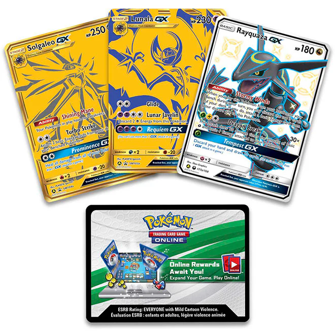 - 3 full-art foil cards: Shiny Rayquaza-GX plus special gold versions of Solgaleo-GX and Lunala-GX