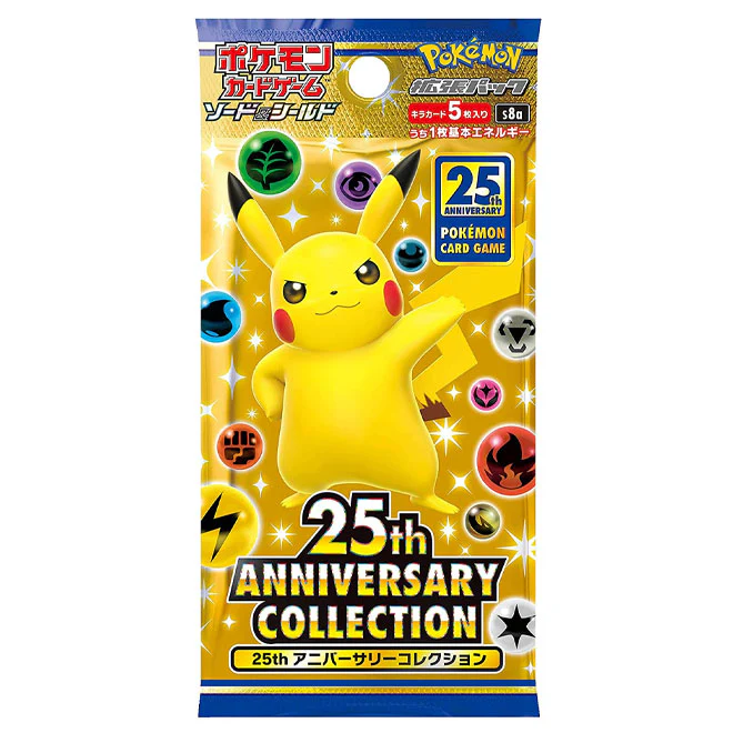 The 25th Anniversary Collection, was released on October 22, 2021. Both sets feature Legendary and Mythical Pokémon from across the span of the franchise in addition to a selection of different Pikachu cards. Some of these revisit concepts from the Original Series and update them with mechanics and aesthetics from the Sword & Shield Series. Several promotional cards included in Celebrations merchandise similarly feature previous TCG mechanics Dark and Light Pokémon, δ Delta Species, Pokémon ☆, Pokémon LV.X, Pokémon SP, and Pokémon Prime with species introduced after they were discontinued. Most of these “remixed” cards have the clause (This card cannot be used at official tournaments.) under the copyright. These cards, as well as those included in the Celebrations expansion, feature the Pokémon 25th Anniversary logo, while all cards from the 25th Anniversary Collection feature a blue and gold “25th” graphic. Each 25th Anniversary Collection pack contains five.
