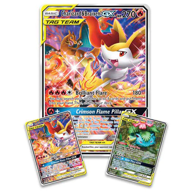 - 2 foil promo cards featuring TAG TEAM Pokémon: Charizard & Braixen-GX and Venusaur & Snivy-GX!